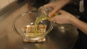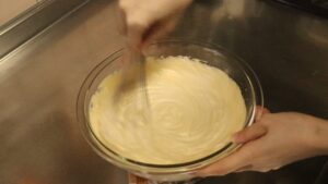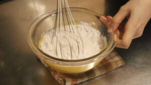 だいたい混ざり合ったら、今度は泡立て器で底から生地をすくい上げるように混ぜ合わせます。