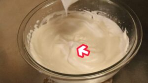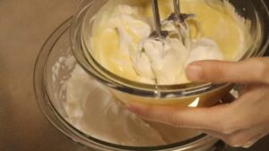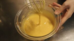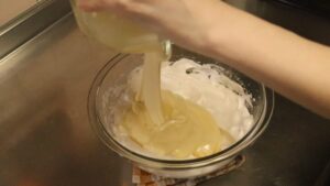 泡立て器でぐるぐる混ぜて、メレンゲの塊が残らないように混ぜ合わせます。
