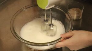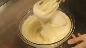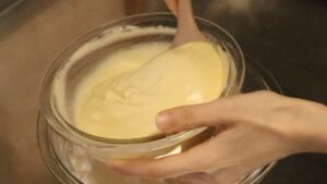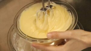 ハンドミキサーを低速に切り替えて1分ほどゆっくりと混ぜて、キメを整えます。