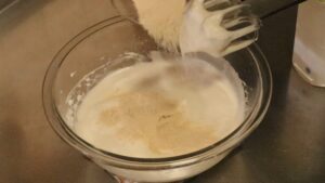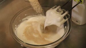 残りのきび砂糖の全量を加えてハンドミキサーの高速で泡立てます。