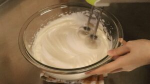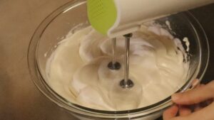 冷やしておいた卵白をボウルに入れて、ハンドミキサーで軽く泡立てます。