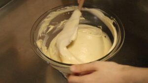 ボウルの底にまだ混ざりきっていない生地があるので、ゴムベラに替えて、底をさらっては返す動きで合わせます。