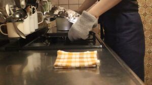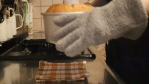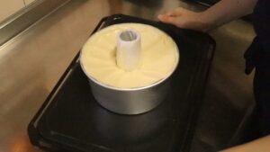 焼き上がったら、低い位置から軽く落としてショックを入れます。