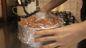 切り取ったオーブンシートを、しっかりと巻き付けます。