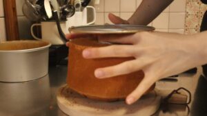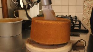 底面も同じように型にナイフを添わせたまま1周させて、生地を外します。