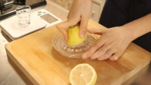 ・皮をすり下ろしたレモンを半分にカットして、1/2個分の果汁を絞ります。生地用に20gあるといいです。もし足りなければ残りのレモンを絞るか、市販のレモン果汁を足してもらっても大丈夫です。