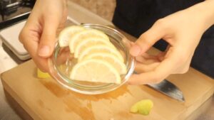 ・残りのレモン1/2個は、トッピング用に必要な枚数を薄くスライスします。