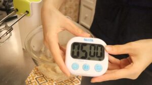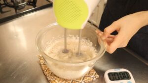 ハンドミキサーで約5分、攪拌して生地に空気を含ませます。