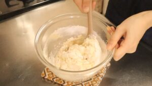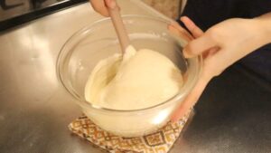 ボウルの側面に飛んだ生地をゴムベラでこそげ落とし、底から返すように均一に混ぜます。