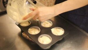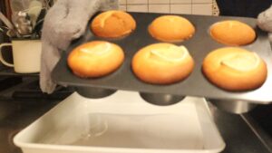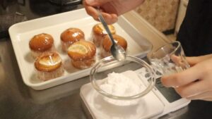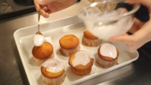 アイシングをかけたい場合はマフィンが完全に冷めてからアイシングを。粉糖40gにレモン汁6g前後を加えて混ぜ、上からかけます。